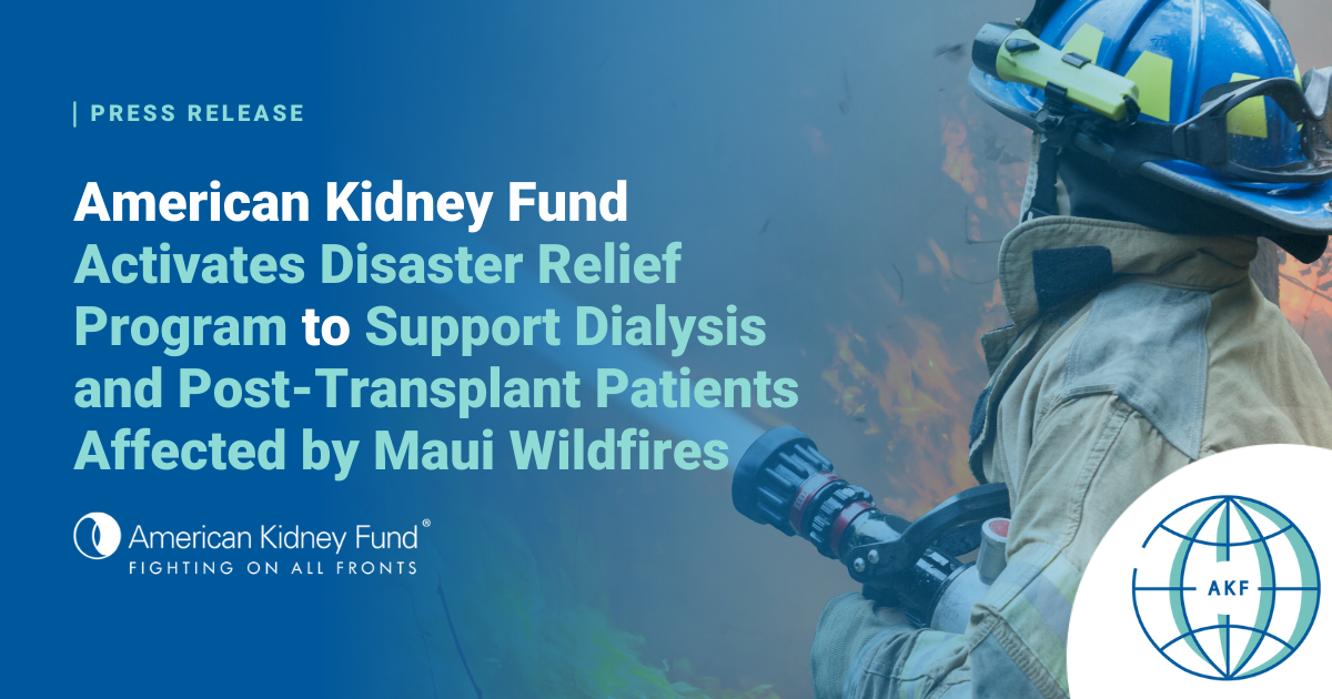 People with kidney failure are particularly susceptible to difficulties during a natural disaster, as interruptions to dialysis treatments can put them at risk for being hospitalized. AKF has developed a resource page for Maui residents impacted by the fires.