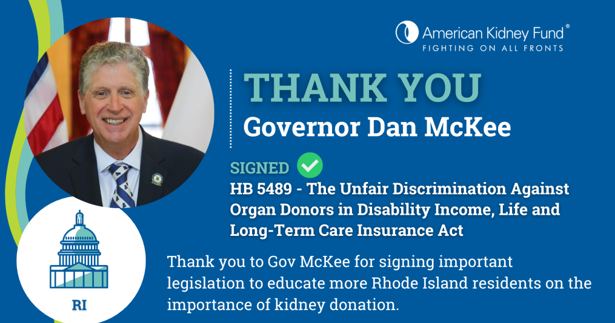 ROCKVILLE, Md. (June 23, 2023) – The American Kidney Fund (AKF) applauds Rhode Island for making living organ donor protections state law with HB 5489, signed into law earlier this week by Gov. Dan McKee. The bill, named The Unfair Discrimination Against Organ Donors in Disability Income, Life and Long-Term Care Insurance Act, is now in effect and prohibits insurers from denying life, health, disability and long-term care insurance to individuals solely based on their status as a living organ donor.