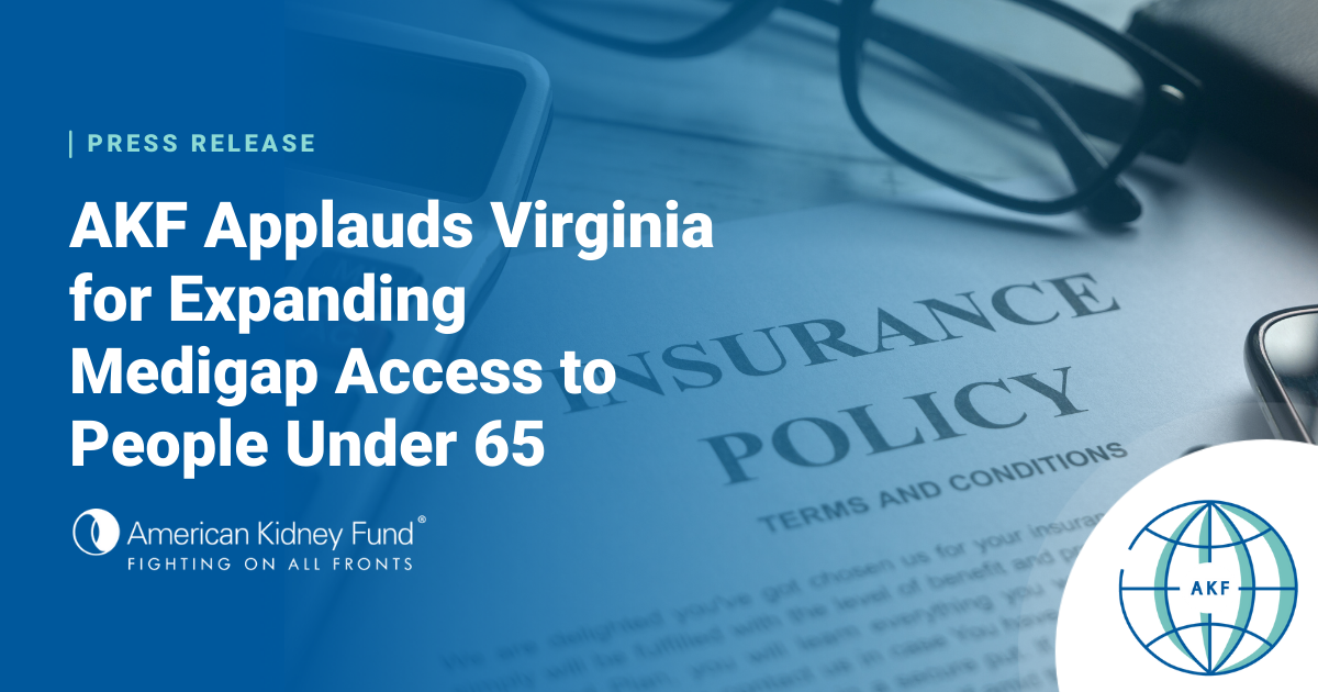 ROCKVILLE, Md. (March 24, 2023) — The American Kidney Fund (AKF) applauds the state of Virginia for enacting SB 1409/HB 1640. This new law requires that Medicare supplemental policies, or Medigap, be made available to people with disabilities that qualify for Medicare, including people with end-stage renal disease (ESRD), who are under age 65.