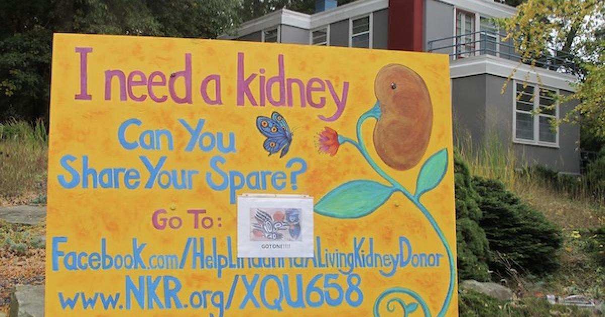 The signs were part of Linda's larger effort to find a kidney donor. After learning she would need a transplant, Linda was disappointed to find out that none of her family or friends qualified to be her donor. That's when Karen Godfrey, Linda's "friend and super advocate," connected her to Harvey Mysel, a two-time kidney transplant recipient and the founder of the Living Kidney Donors Network.