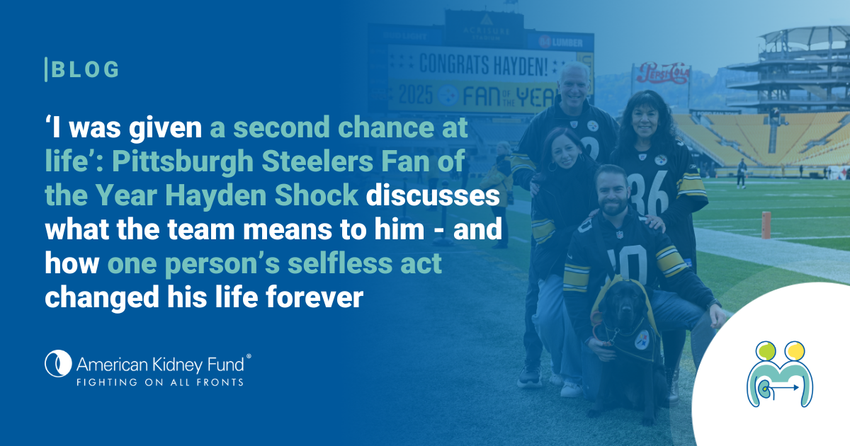 In August 2016, Hayden began hemodialysis. "Dialysis was very challenging for me," he said. "Coping came down to mindset. I understood that dialysis was keeping me alive. In order to survive and eventually get to a transplant, I had to commit to it fully." In addition, Hayden coped by watching his beloved Steelers. "No matter how tough things felt, I always knew I had the Steelers to look forward to," he said. "It became a sense of normalcy during a time when almost nothing felt normal."