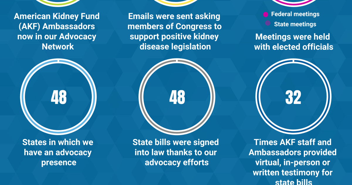 Despite the ongoing challenges of the COVID-19 pandemic, the American Kidney Fund (AKF) was still able to successfully advocate throughout 2021 for policies that help improve the lives of those with kidney disease and living organ donors. Thanks to our Government Affairs team and the tireless advocacy of our wonderful network of more than 17,000 Ambassadors, AKF achieved some truly outstanding accomplishments last year: