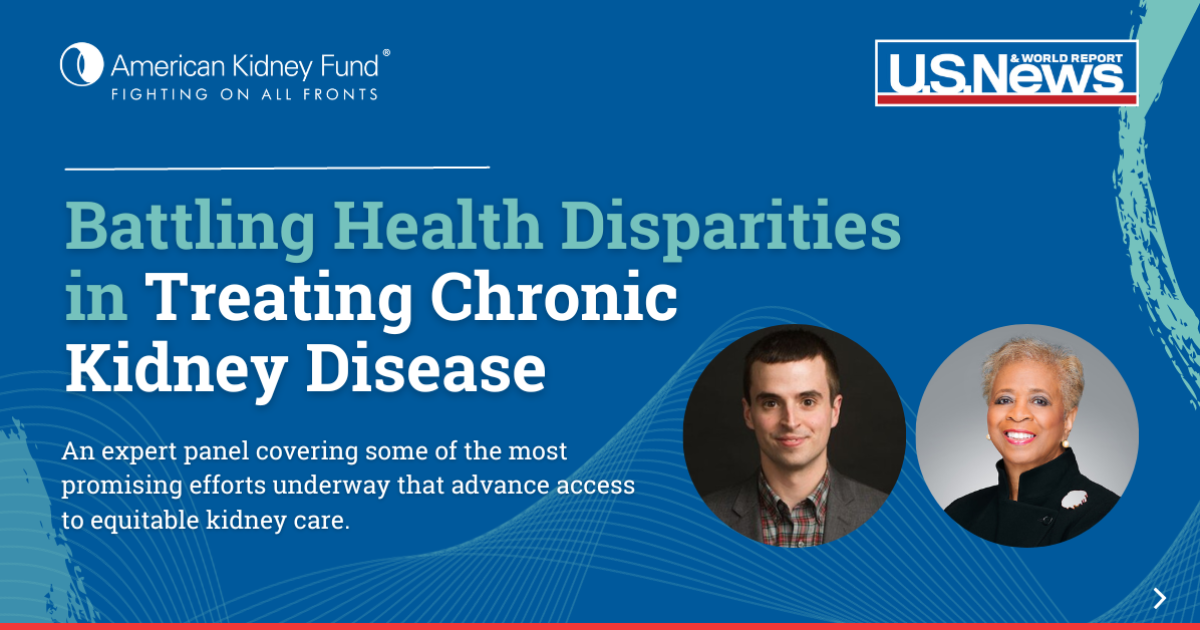 On Tuesday, May 9 at 12 p.m. ET, U.S. News & World Report will host a webinar sponsored by AKF about battling health disparities in treating chronic kidney disease. Viewers will hear from an expert panel, including AKF's President and CEO, LaVarne A. Burton, about some of the most promising efforts underway to improve access to effective kidney care for all.
