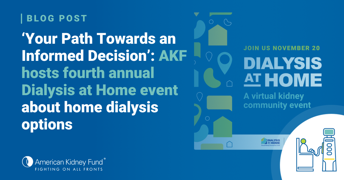 On Nov. 20, the American Kidney Fund (AKF) hosted its fourth annual Dialysis at Home event. Each year, this free, virtual event brings together members of the dialysis community for a full day of sessions about home dialysis. Throughout the day, attendees heard from both patient advocates and health care professionals on topics such as home dialysis options, making the switch to dialysis, mental health support, building trust and access in underserved communities and the latest innovations in home dialysis care.