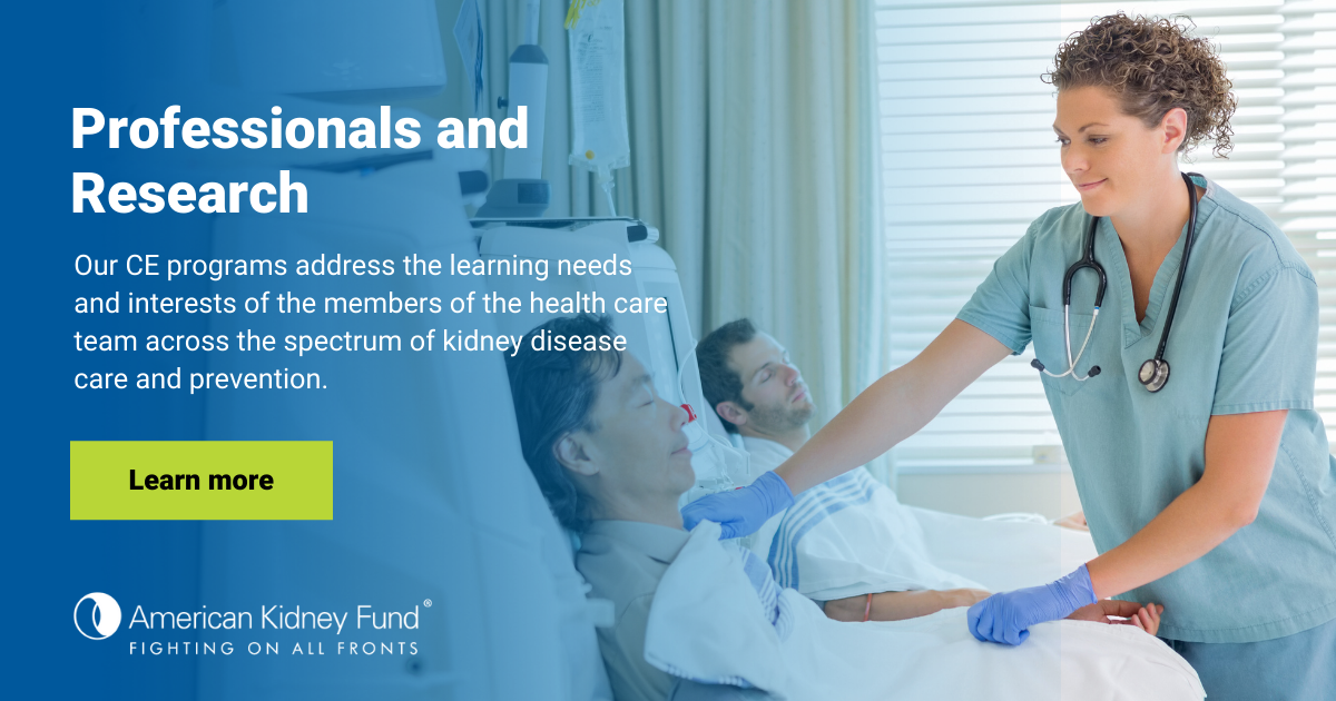 We offer a range of online continuing education courses designed for health care professionals caring for patients with, and at risk for, chronic kidney disease. All of our online courses are free and are accredited for continuing education credits by professional health care associations.