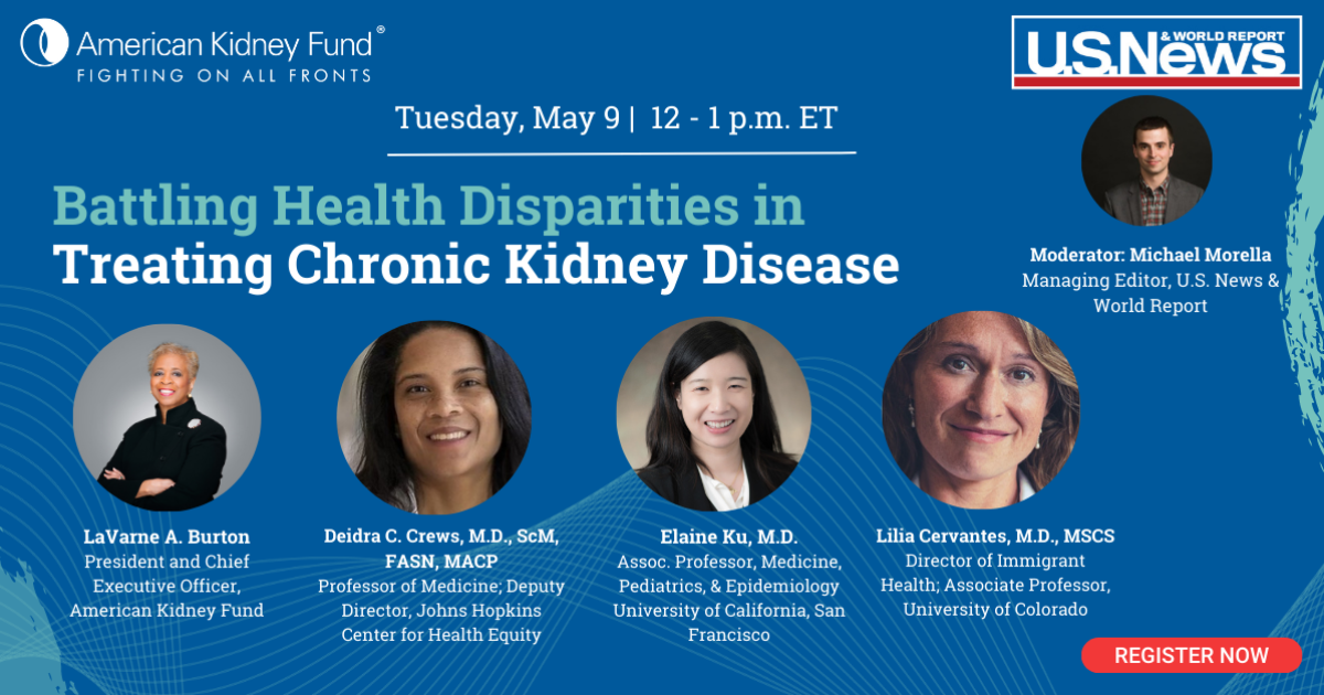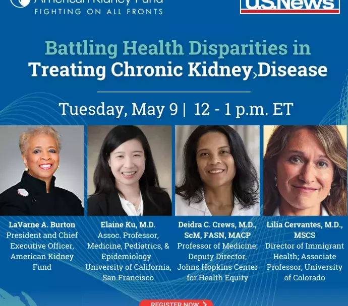 Chronic kidney disease affects more than 1 in 7 adults in the U.S., and the condition takes a disproportionate toll on people of color. Some causes are genetic, but studies have shown that social determinants of health, structural racism and implicit bias can result in Black and Hispanic people facing disparate kidney health outcomes. The COVID-19 pandemic reversed progress being made in saving lives from CKD, particularly among communities of color. Achieving health equity in kidney disease is a complex challenge that brings together providers, community health organizations and patient groups alike to find actionable solutions and meaningful policy moves on a number of fronts. In this webinar, hear from an expert panel about some of the most promising efforts underway to improve access to the most effective kidney care for all.