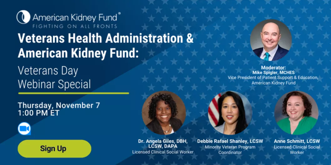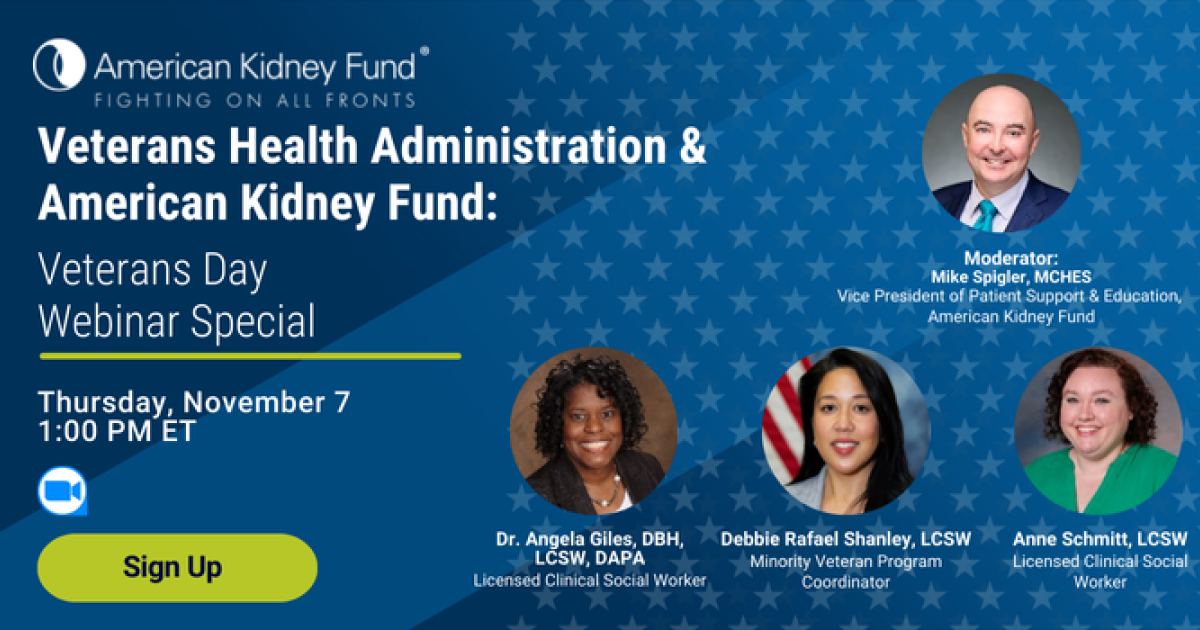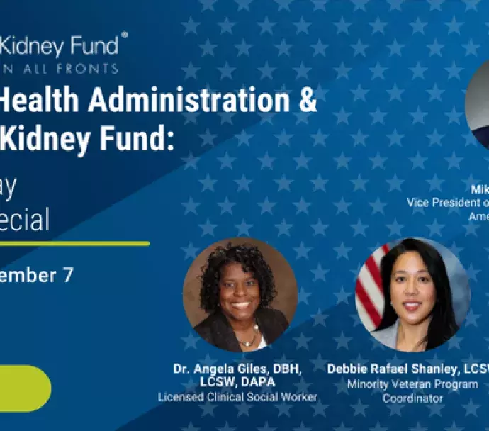 The American Kidney Fund (AKF) has partnered with the U.S. Department of Veterans Affairs (VA) Veterans Health Administration to increase awareness of kidney disease among U.S. veterans and to support veterans who have been diagnosed with kidney disease.