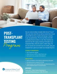 Programs and servicesAKF's program to help pay costs of testing after a kidney transplantDiscover the AKF's program to help pay the costs of new blood tests after a kidney transplantDownload services and programs sheet on costs of testing after a kidney transplant